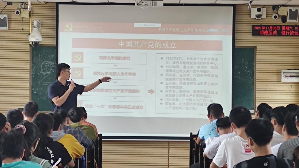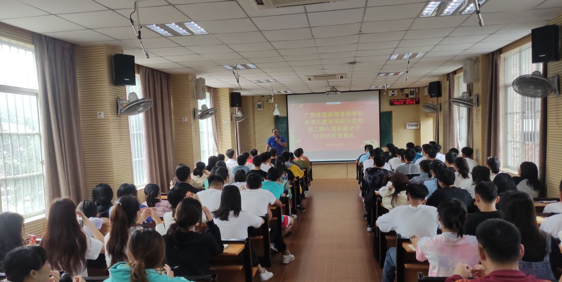 体育与教育学院党总支副书记危泳键参加开班典礼并致辞,体育与教育学院学生第一支部书记陈潜担任当天的授课教师。陈潜老师从:党的基本知识、习近平新时代中国特色社会主义思想、中国共产党百年光辉等内容展开讲授。