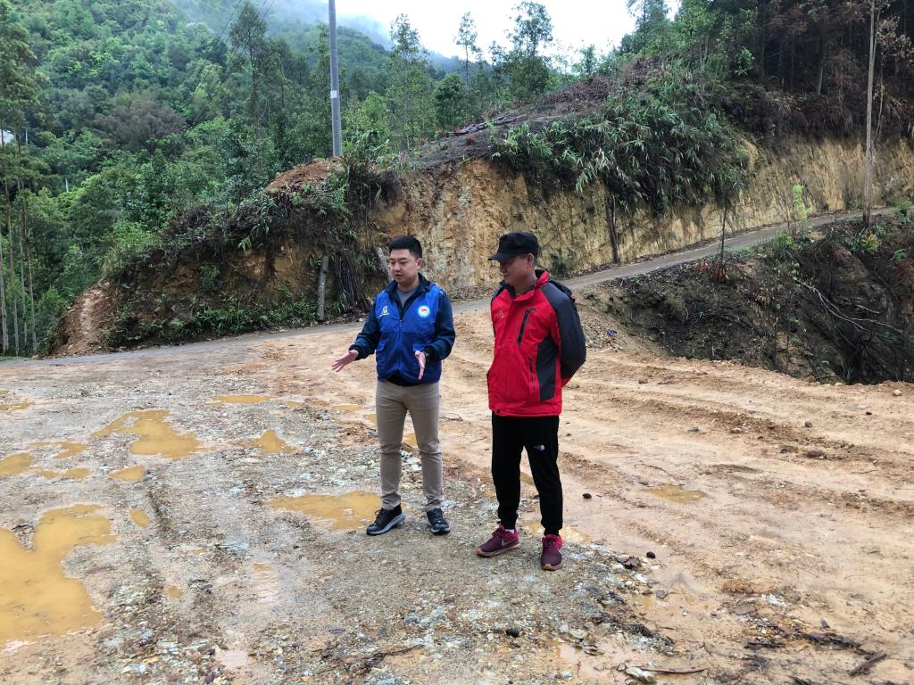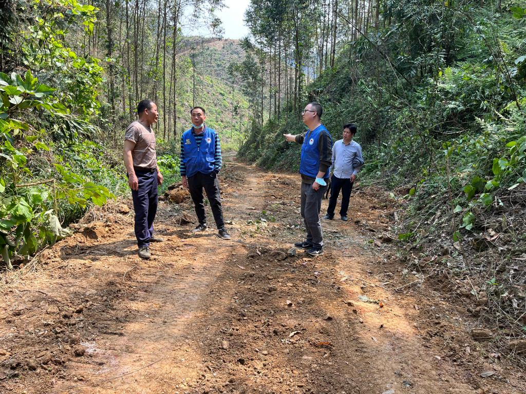 宁康乡料南村第一书记李正辉(右二)同工作队、村委干部到百强组了解六堡茶产业道路建设困难