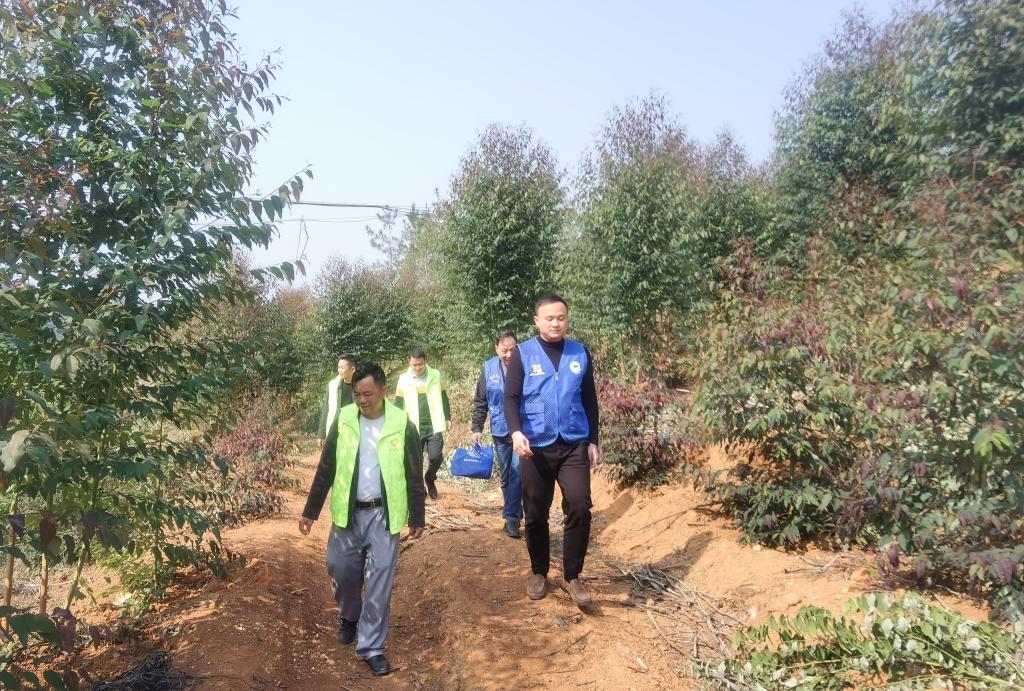 古龙镇长沙村第一书记王宁(右一)连同工作队员和村“两委”干部,走村入户实地查看,宣传和推广六堡茶种植