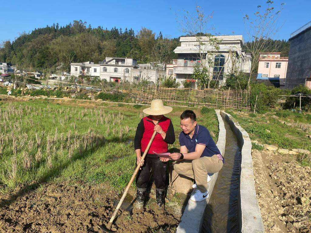 宁康乡永太村驻村第一书记梁祖卓(右一)深入田间与村民宣传六堡茶种植各项政策