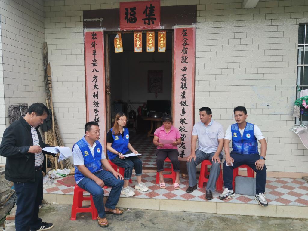 东荣镇杨垌村第一书记李鸿辉(右一)入户开展六堡茶种植政策宣讲