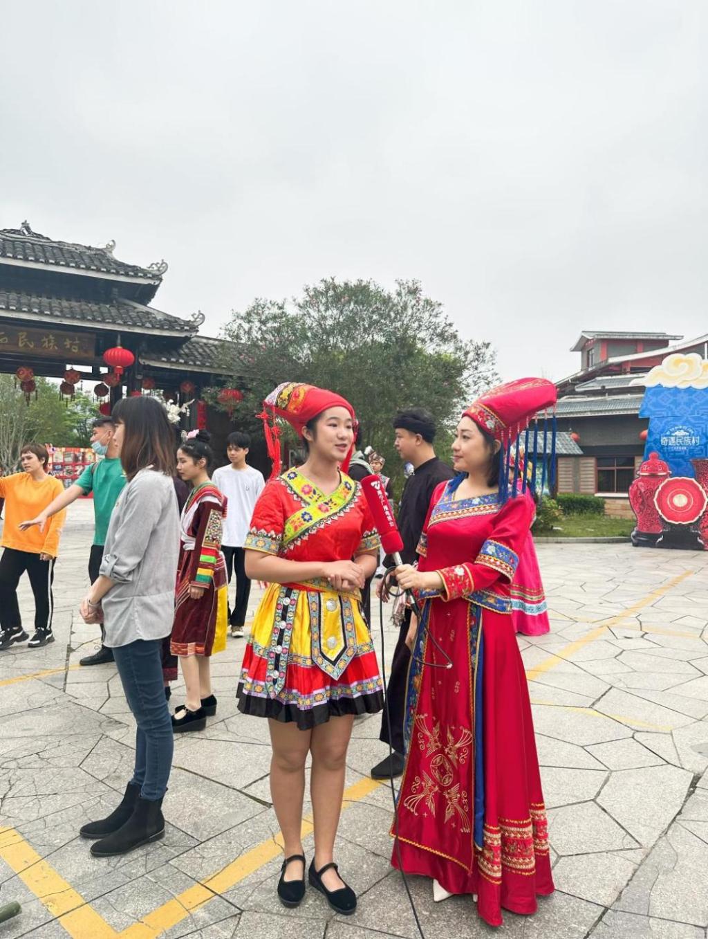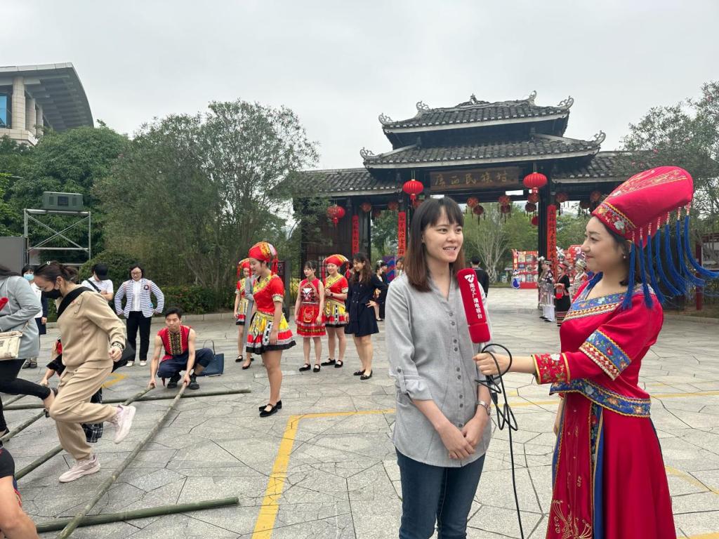 接着,党员们身着民族服饰,来到广西民族博物馆民族村,跳起欢快的竹竿舞,领略不同地区、不同风格的“三月三”习俗,感受壮乡瑰丽的民族文化。活动期间,南宁广播电视台对学院学生第三党支部书记和入党积极分子分别进行了采访。