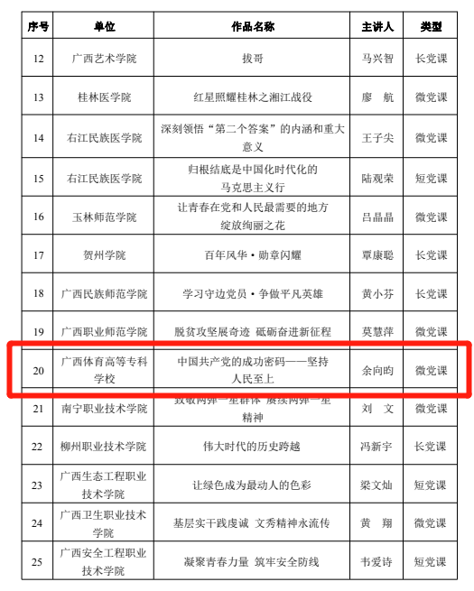 近日,自治区党委教育工委通报了2022年度全区学校“优秀党课”评选结果,我校体育与教育学院庾茜颖老师的党课《时空对话——回信》荣获全区学校“优秀党课”一等奖,马克思主义学院余向昀老师的党课《中国共产党的成功密码——坚持人民至上》荣获全区学校“优秀党课”三等奖。