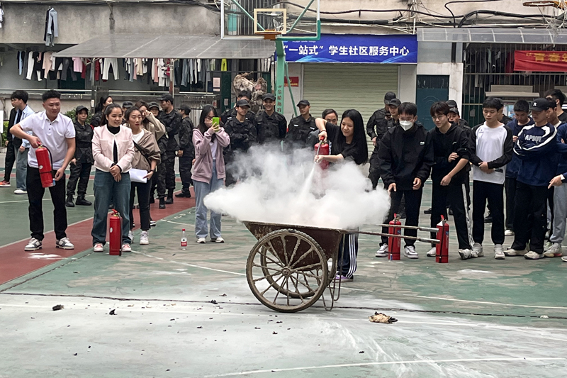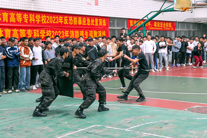 16时30分,演练总指挥覃世东副校长宣布:“广西体专2023年反恐防暴、消防灭火演习、紧急逃生自救演练开始。”演练正式拉开序幕,本次演练分三个阶段进行,紧扣当前校园安全管理重点。第一阶段模拟校外暴力分子持刀打伤宿门卫保安后,冲进学生宿舍区,护校队与物业安保人员协同作战,制服暴力分子。第二阶段为兴宁区消防救援大队教官们为我校学生教授灭火器的正确使用方法及火灾逃生注意事项,模拟宿舍发生火灾初期,学生使用灭火器第一时间扑灭火源。第三阶段模拟3号公寓楼某学生宿舍因违规使用大功率用电器,发生火灾,学生在按照要求,有序疏散逃生。