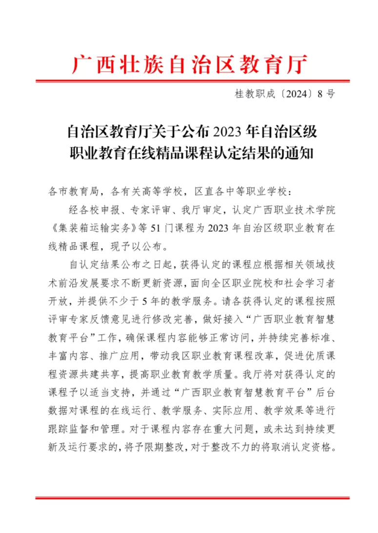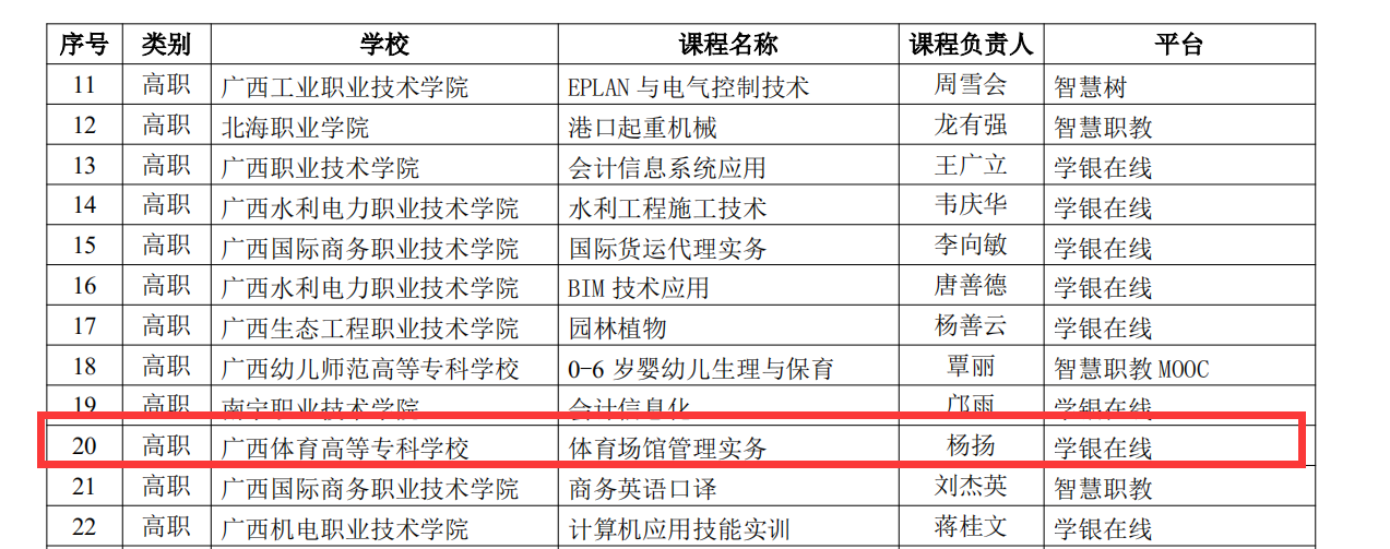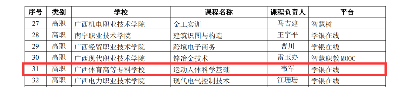 近日,自治区教育厅印发《自治区教育厅关于公布2023 年自治区级职业教育在线精品课程认定结果的通知》,共认定了51门职业教育在线精品课程。我校杨扬副教授负责的《体育场馆管理实务》和韦军教授负责的《运动人体科学基础》成功入选。