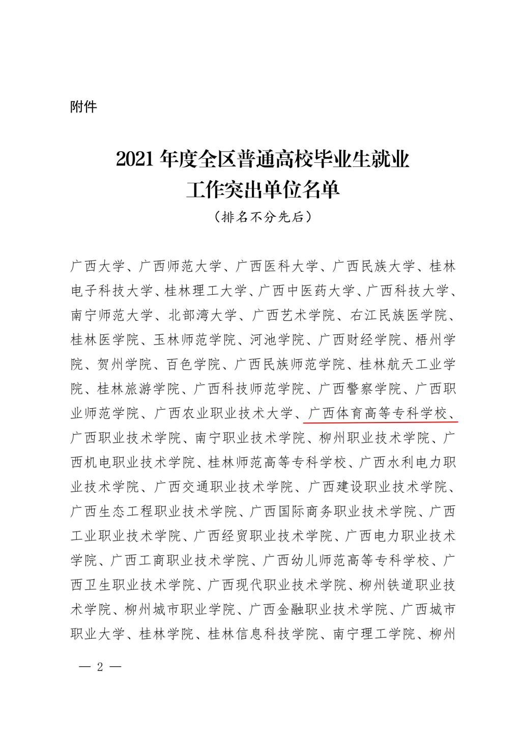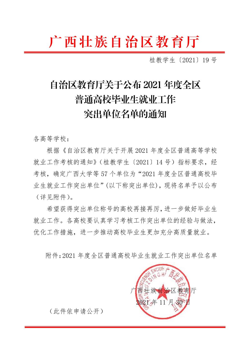 根据自治区教育厅11月30日下发的《关于公布2021年度全区普通高校毕业生就业工作突出单位名单通知》(桂教学生〔2021〕19号)文件,经考核,我校荣获“2021年度全区普通高校毕业生就业工作突出单位”称号。