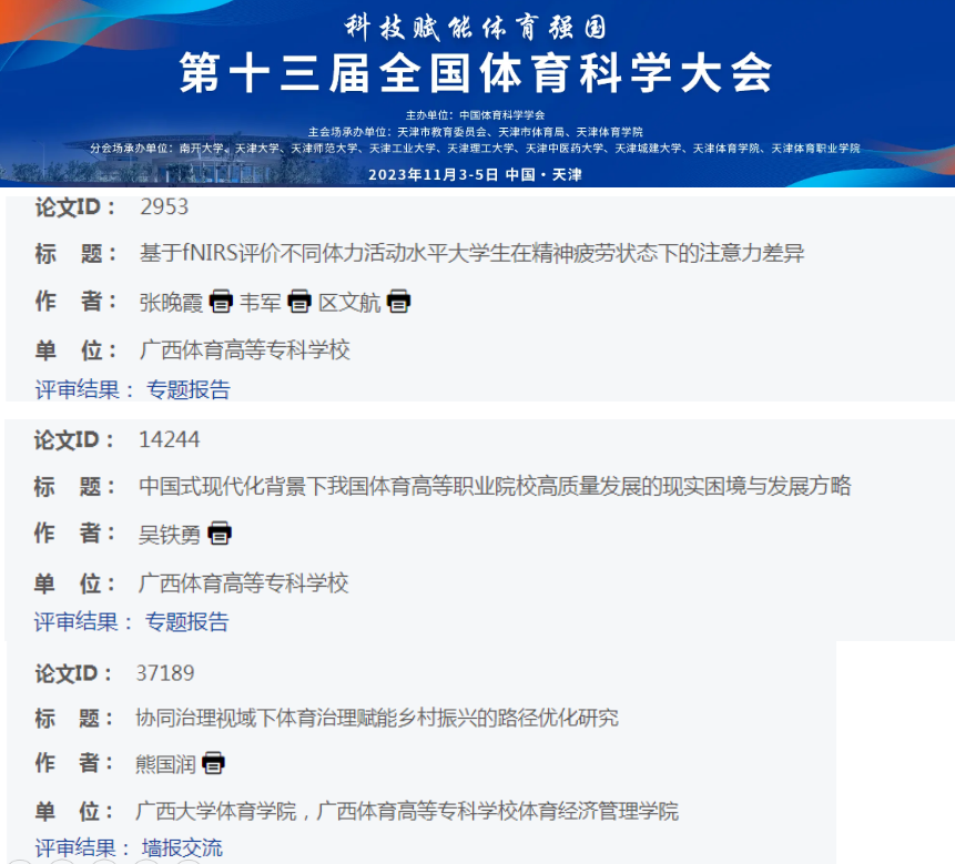 近期,第十三届全国体育科学大会论文录取结果公布。我校吴铁勇老师撰写的论文《中国式现代化背景下我国体育高等职业院校高质量发展的现实困境与发展方略》、张晚霞老师撰写的论文《基于fNIRS评价不同体力活动水平大学生在精神疲劳状态下的注意力差异》录取为专题报告。熊国润老师撰写的论文《协同治理视域下体育治理赋能乡村振兴的路径优化研究》录取为墙报交流。我校入选体育科学大会的数量再创新高,充分展现了我校教师在体育科学研究领域的风貌。