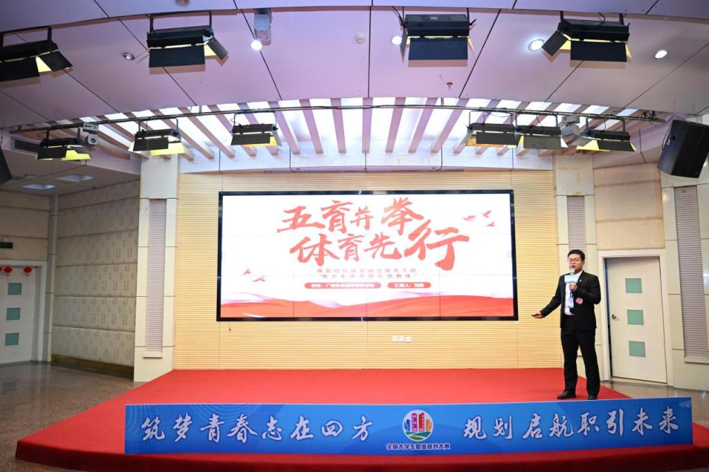据悉,首届全国大学生职业规划大赛旨在更好实现以赛促学,引导大学生树立正确的成才观、就业观和择业观,科学合理规划学业与职业发展,提升就业竞争力。此次广西赛区现场总决赛职教组分设就业赛道与成长赛道,就业赛道包括主题陈述和综合面试两个环节,主要考察选手陈述个人求职意向和职业准备情况,展示通用素质与岗位能力。刘森同学围绕“五育并举、体育先行”主题,以“青少年体育俱乐部教练”为求职目标,从职业认知、自我认知、岗位能力胜任、发展规划四个方面,向评委讲述了作为新时代广西体育人在我校“双高”建设和高质量发展背景下,结合我校“立足体育本色、服务人民健康、培养高素质技术技能人才”办学特色,紧紧抓住新时代“体育强国”“教育强国”“文化强国”建设新机遇,立志成为青少年体育俱乐部教练的职业愿景。