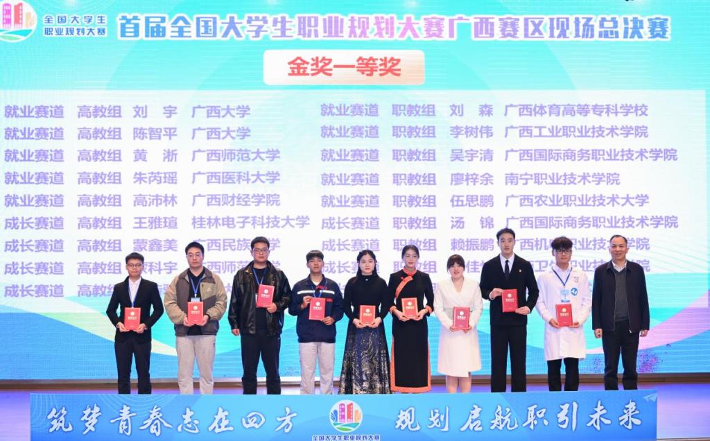 筑梦青春志在四方,规划启航职引未来。3月12日至13日,由自治区教育厅主办的首届全国大学生职业规划大赛广西赛区现场总决赛在广西师范大学成功举办,我校有两位选手分别参加总决赛职教组就业赛道、成长赛道的角逐,均获区赛金奖。其中,赵海霞老师团队指导的2021级社会体育专业刘森同学获得职教组就业赛道金奖一等奖,顺利晋级国赛。