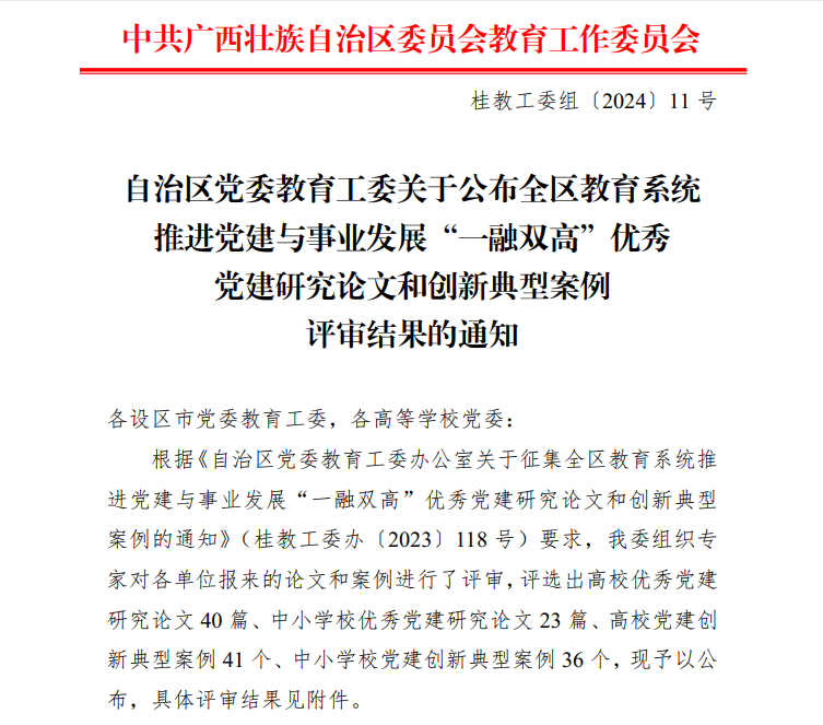 近日,自治区党委教育工委公布了全区教育系统推进党建与事业发展“一融双高 ”创新典型案例获奖名单,我校运动健康学院党总支部的《聚焦“四对标”工作法 打造“体卫融合 厚德健行”党建模式》案例荣获创新典型案例高校组一等奖。