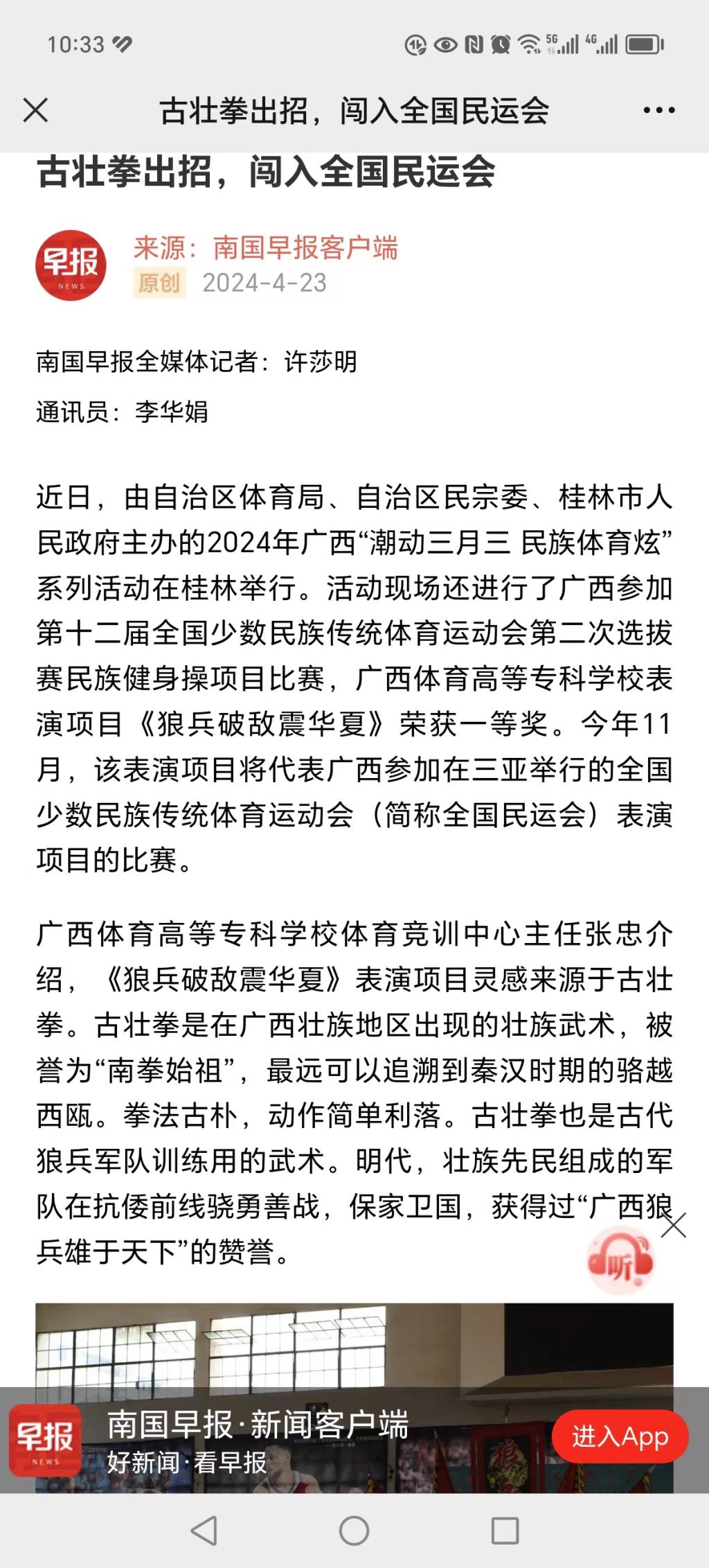 我校体育竞训中心主任张忠:“为了备战今年11月的全国民运会,我们将从器材、编排、配合、动作等方面进行重大调整,争取拿到好名次,同时把我们古壮拳带到全国甚至世界舞台,让更多的年轻人接受和传承。”