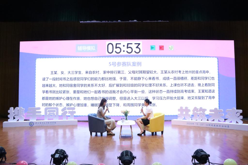 本次大赛分初赛和决赛两个阶段,共有26支队伍报名参与,经过前期的知识测试和短视频的评比,共有11支队伍进入决赛。决赛为朋辈心理辅导现场模拟环节,11支队伍在决赛当中,运用真诚、尊重、共情、具体化和积极关注等心理辅导技术,协助来访者解决因人际关系、学习适应、就业规划、自我意识偏差等问题产生的心理冲突和困扰。经过三个小时的激烈角逐,来自运动健康学院的陈渝钰、田昭妍、冯钧雪同学的团队荣获一等奖。
