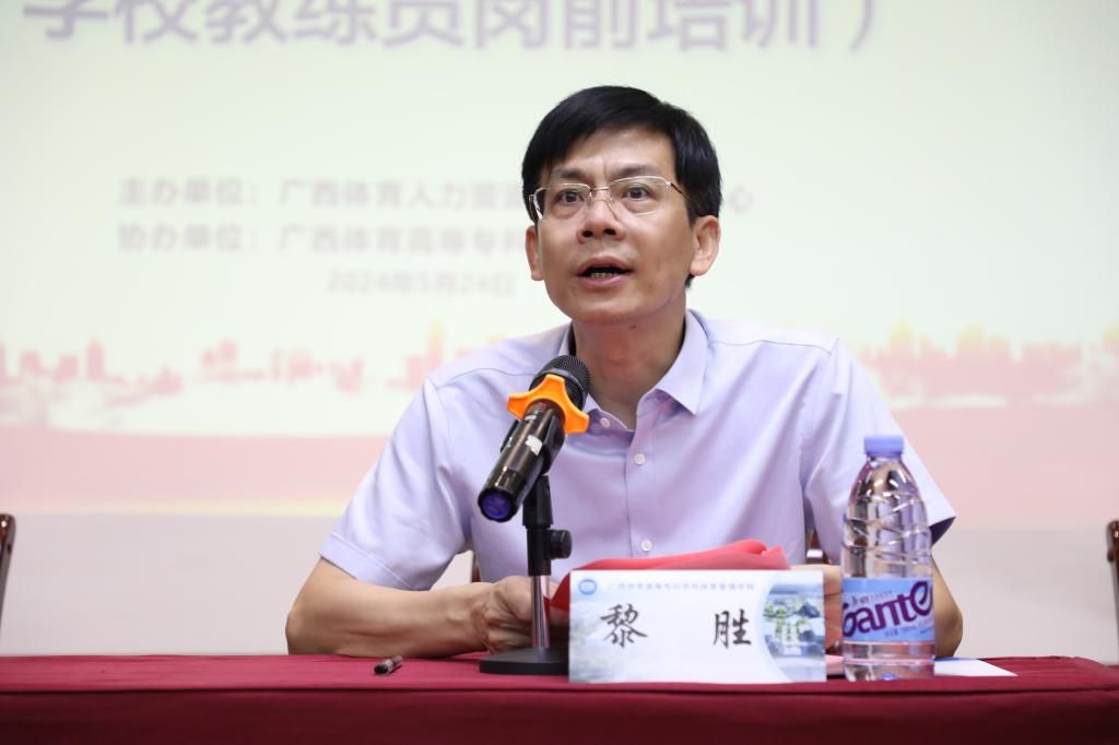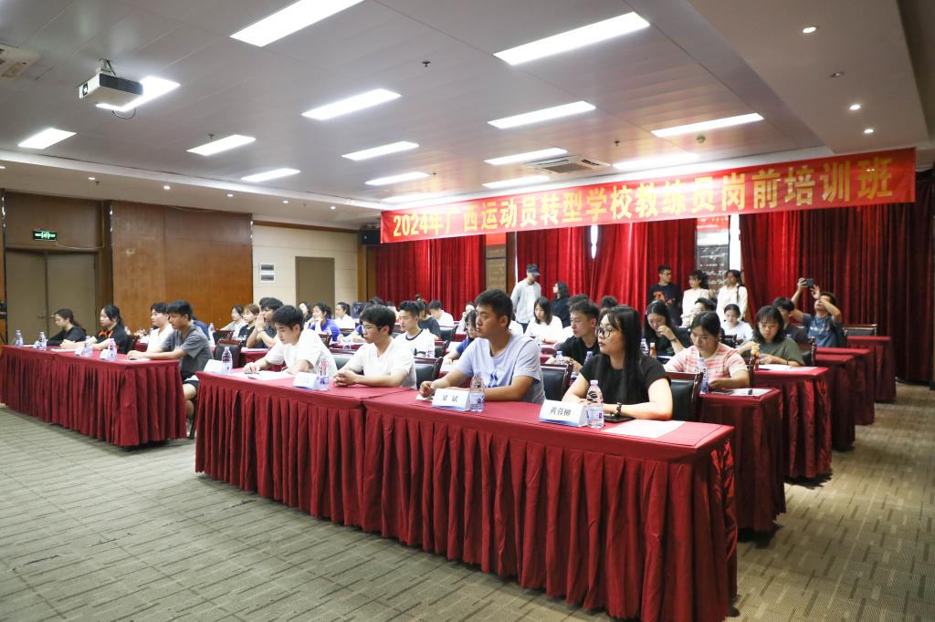 2024年5月24日上午,2024年广西运动员转型学校教练员岗前培训班开班仪式在77779193永利集团举行。广西体育人力资源开发和保障中心主任吴少兴、77779193永利集团副校长黎胜、广西体育人力资源开发和保障中心六级职员吴春梅、77779193永利集团体育管理学院党总支书记黎智达、77779193永利集团体育管理学院副院长杨扬出席开班仪式,仪式由77779193永利集团继续教育学院副院长农世力主持。此次培训旨在深入贯彻国家体育总局、中央编办、教育部和人力资源社会保障部联合发布的《关于在学校设置教练员岗位的实施意见》(体人规字〔2023〕3号),为广西地区退役运动员转型成为学校教练员提供系统、专业的岗前培训。