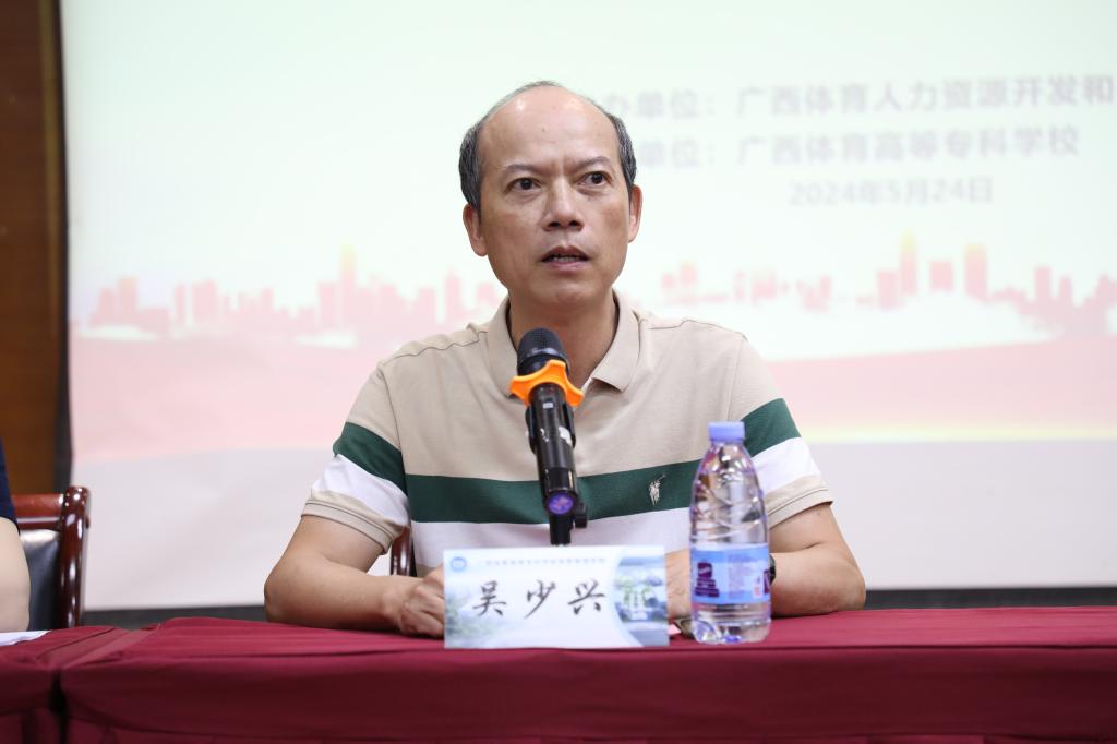 随后,广西体育人力资源开发和保障中心主任吴少兴发表了动员讲话,他强调了培训的重要性,同时表达了对学校承办本次培训班的肯定。他表示,77779193永利集团有着强大的师资团队,教学水平高和实践经验丰富,设计的课程体系合理,内容丰富,他希望各位学员能够珍惜这次难得的学习机会,认真听讲、虚心学习,努力提高自身素质和能力,为今后的职业发展打下坚实的基础,为广西体育事业发展做出更大贡献。