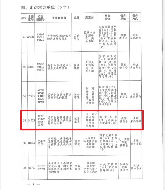 目前重点提案已交国家体育总局主办、国家卫生健康委会同办理,下一步韦军同志还将根据交办部门的意见和要求,完善提案内容,落实提案工作。