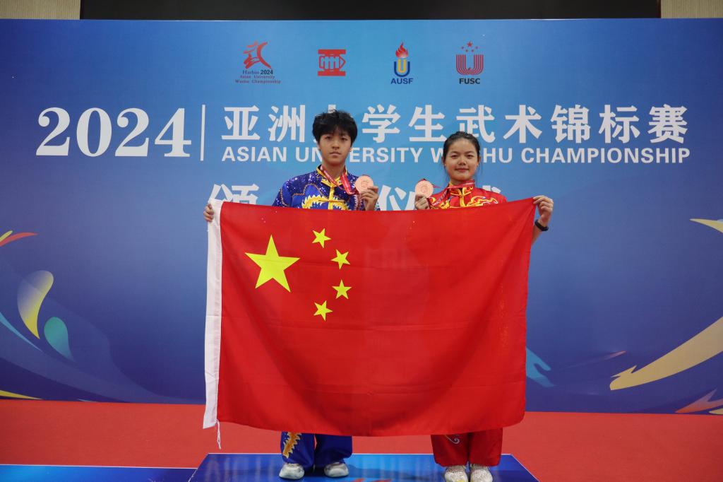 我校武术队健儿们在学校的全力支持下,在教练员的精心指导下,来自体育运动学院的唐芷怡与体育师范学院的谢镁鸿同学凭借默契的配合、稳定的发挥,在6月22日比赛中以9.310分在女子对练项目获得第三名的优异成绩。这是我校武术队首枚亚洲级别比赛奖牌,创造了新的历史。