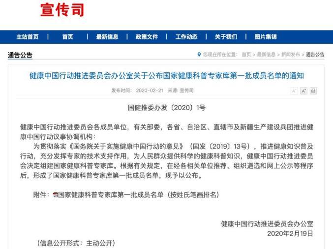 经各相关单位推荐、组织遴选和网上公示等程序后,全国1069人入选国家健康科普专家库第一批成员名单。李翠霞教授是运动、营养与食品安全专业领域首批入选的国家健康科普专家。