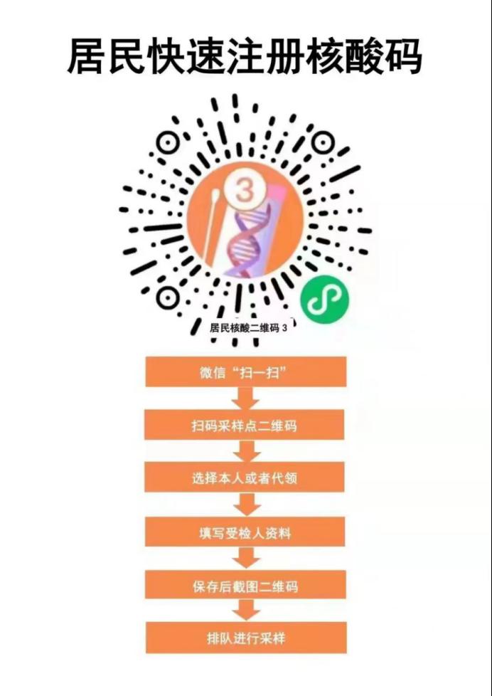(一)参加核酸检测的人员,请提前打开微信“扫一扫”扫“居民快速注册核酸码”,按照步骤进行填写,现场核酸检测时调出二维码给工作人员扫码。“居民快速注册核酸码”(附后)。