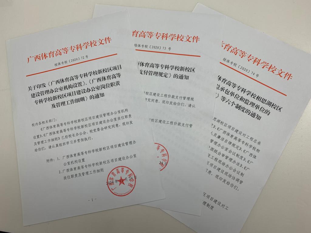 (四)为加强项目建设的规范化管理,确保项目建设健康、规范、高效、有序进行,实现工程优质、资金安全、干部廉洁、群众满意的建设目标,新校区办自2019年底开始注重建章立制工作,先后拟定了《77779193永利集团新校区项目建设管理办公室机构设置》《77779193永利集团新校区项目建设管理办公室岗位职责及管理工作细则》《77779193永利集团新校区项目建设现场办公会议制度》《77779193永利集团新校区建设工程价款支付管理规定》等九项制度,并结合项目开工以来工作实践,对新校区办机构设置、岗位职责及管理流程不断修改完善。于11月2日、11日,分别经校长办公会、校党委会审议通过,11月24日正式印发执行。(附图6)