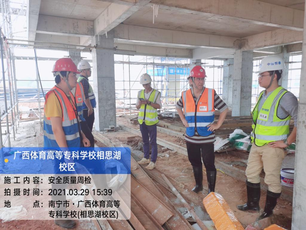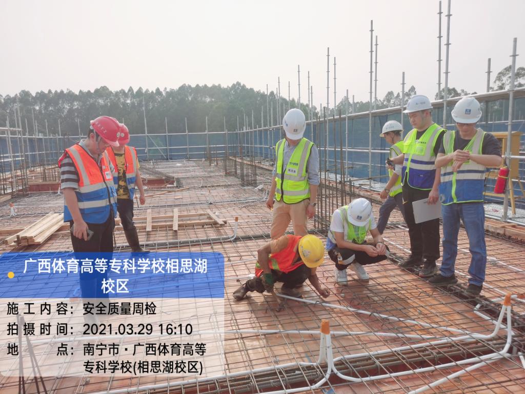 (十三)3月26日,南宁高新技术产业开发区建设工程质量安全监督站一行三人到我校新校区项目现场检查指导工作,就推动建设工程质量验收、质量安全监督计划等进行了现场告知、指导与对接,到施工现场进行了工程实体质量、安全生产情况检查,帮助找出了项目存在的质量问题和施工安全隐患,并提供了改进的意见和建议。我校相思湖校区项目建设管理办公室,以及项目总承包单位、项目监理单位有关负责同志参加。(附图10)