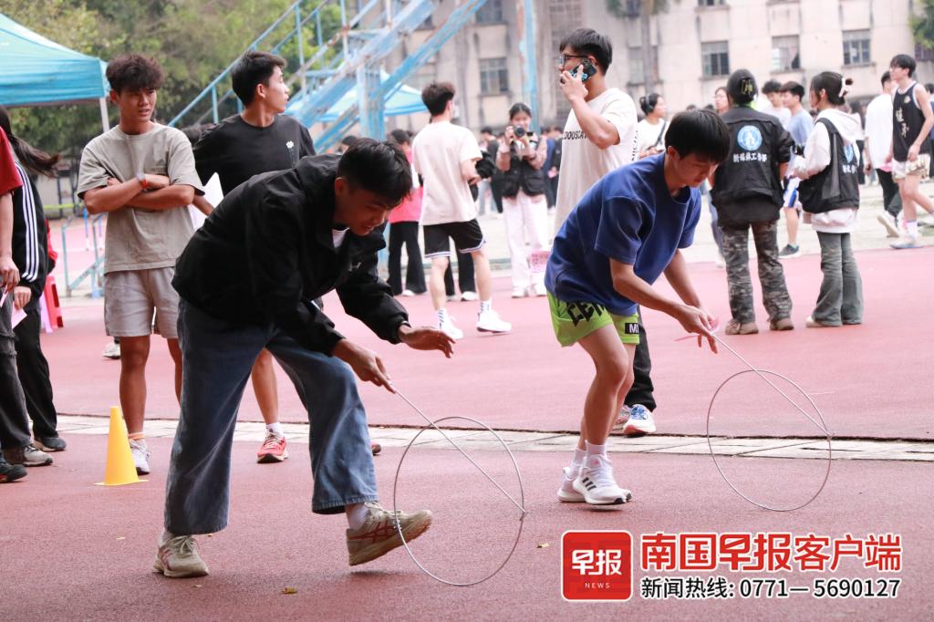 简短的开幕式后,同学们踊跃参加“三月三”民族传统文化体验展示系列活动。民族传统体育体验区设有背篓传绣球、打陀螺、三人板鞋、投壶、踢毽子和滚铁环等民族体育项目;民俗特色文化体验区设有描绘壮美广西DIY团扇及书签、杆舞飞扬、赶歌圩、尝美食等独具民族特色的活动。现场锣鼓喧天,气氛热烈,同学们沉浸在喜悦之中。