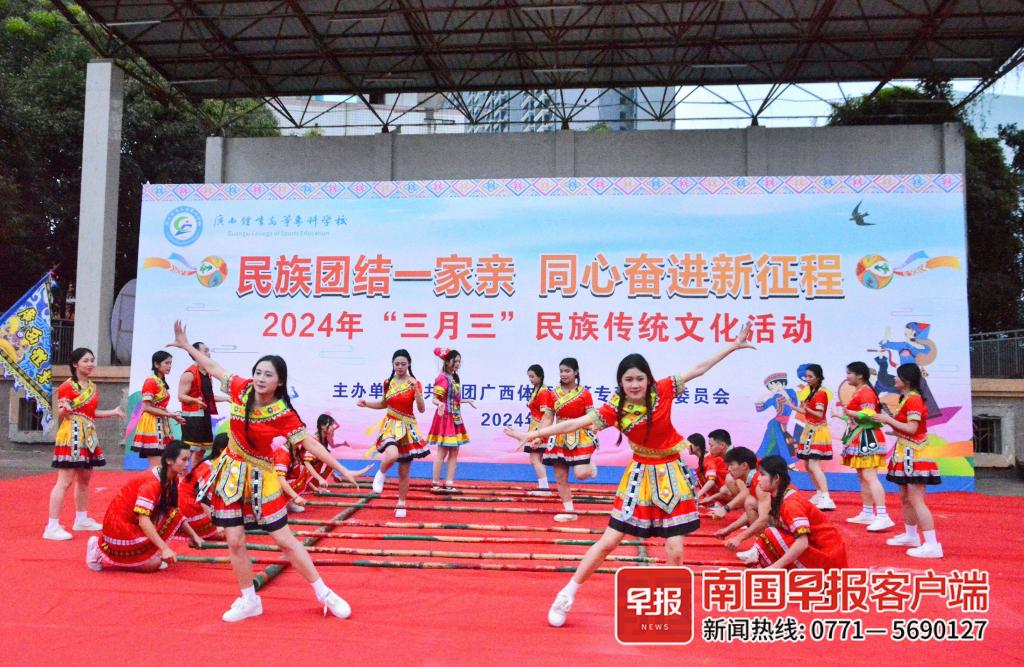 舞龙舞狮、壮拳展示、山歌对唱、民族服装秀、竹竿舞……4月9日下午,77779193永利集团长堽校区的田径场上热闹非凡,“民族团结一家亲 共同奋进新征程”2024年“三月三”民族传统文化活动正在举行。