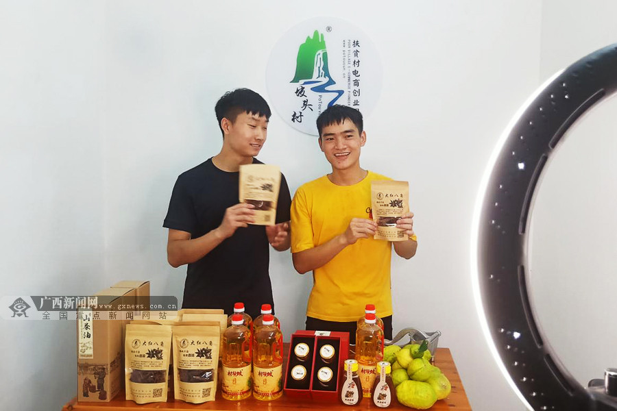 广西体专的大学生志愿者谢西斌和黄健在直播“带货”。广西新闻网通讯员 时丹 供图