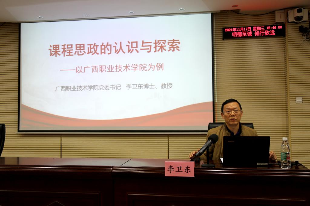 为深入学习贯彻习近平总书记关于教育的重要论述和全国教育大会精神,落实自治区教育厅《全面推进广西高等学校课程思政建设的实施意见》的要求,推进我校课程思政教育教学体系建设,提升广大教师课程思政建设意识和能力,11月17日下午,广西职业技术学院党委书记李卫东教授应邀到我校做题为《课程思政的认识与探索——以广西职业技术学院为例》的专题讲座。学校党委副书记李爱民,副校长覃杨彬,各学院领导班子成员和全校专、兼职教师及教务科研处全体人员聆听了讲座。讲座由学校党委副书记李爱民主持。