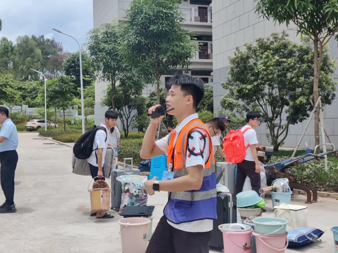 为保证搬迁工作的有序开展,新校区每栋宿舍楼下都有青年教师、学校团委志愿者、学院服务团队挥调度,每辆大巴车上也安排了跟车老师。
