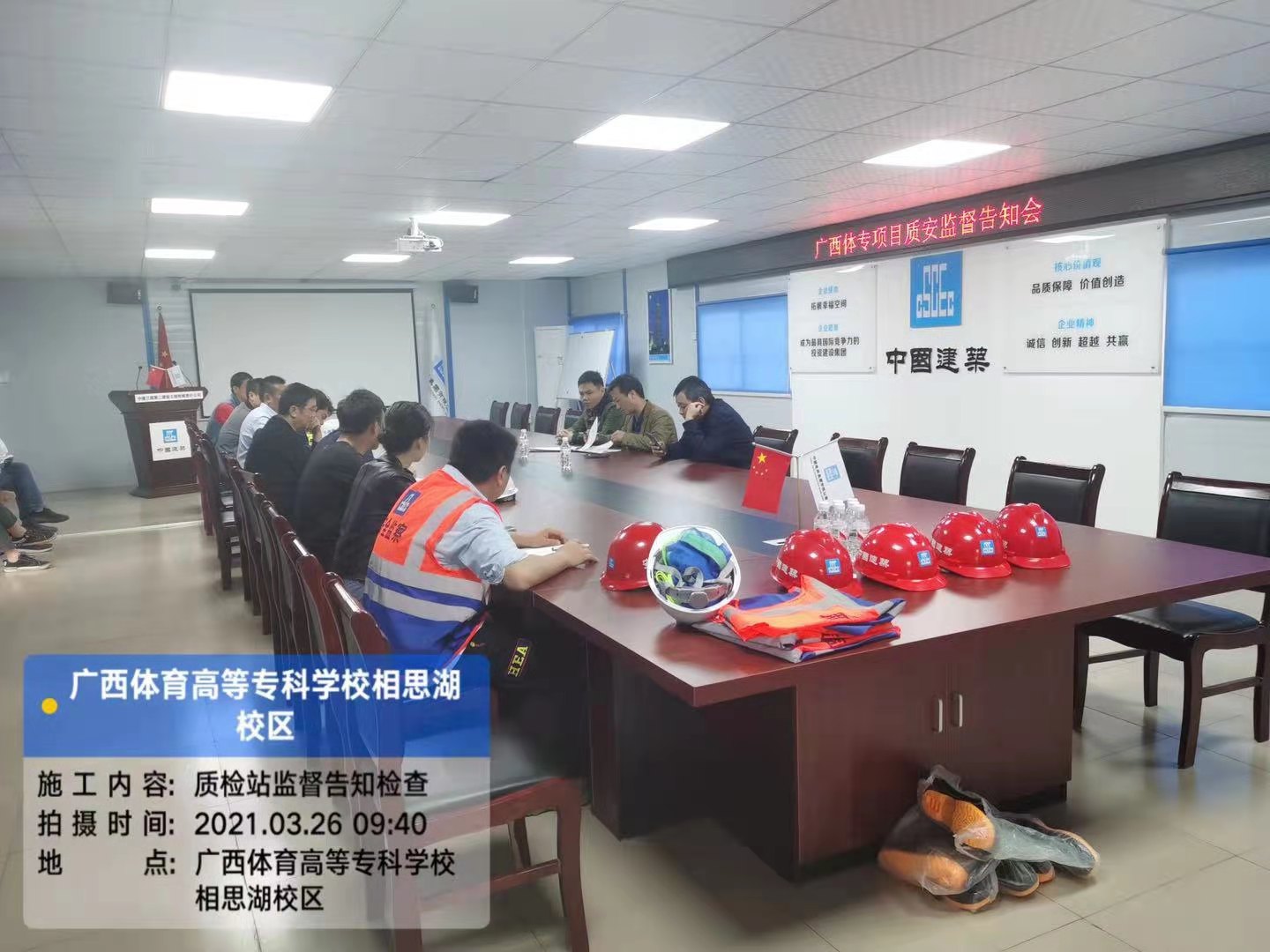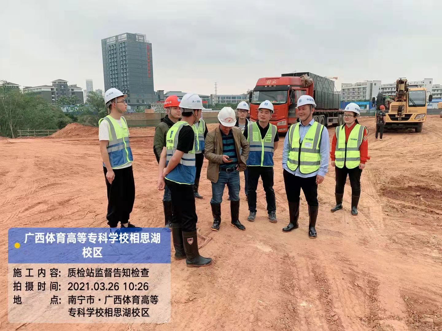 2021年3月26日,南宁高新技术产业开发区建设工程质量安全监督站一行三人到我校新校区项目现场检查指导工作,就推动建设工程质量验收、质量安全监督计划等进行了现场告知、指导与对接,到施工现场进行了工程实体质量、安全生产情况检查,帮助找出了项目存在的质量问题和施工安全隐患,并提供了改进的意见和建议。我校新校区建设管理办公室,以及项目总承包单位、项目监理单位有关负责同志参加。