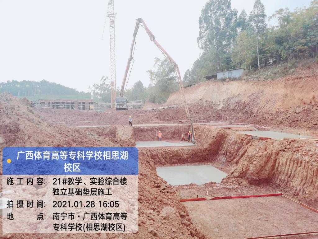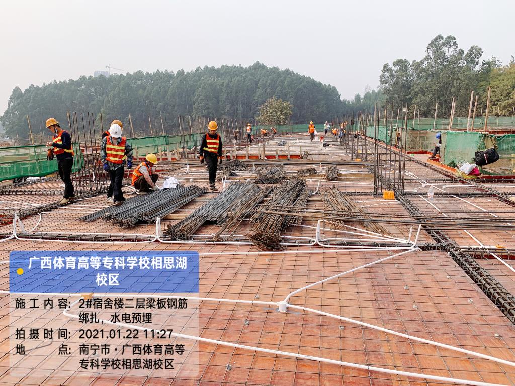 (四)完成1#宿舍楼二层梁板模板安装,二层梁板钢筋绑扎完成80%,二层梁板水电安装预埋完成60%;完成2#宿舍楼二层梁板模板安装、钢筋绑扎和水电安装预埋,以及混凝土浇筑工作;完成教学楼天然地基开挖和桩基垫层,桩顶与承台连接钢筋绑扎完成80%,接桩焊接完成80%;完成B地块西面围墙(1#、2#宿舍楼段)基础垫层砼浇筑。(附图1)