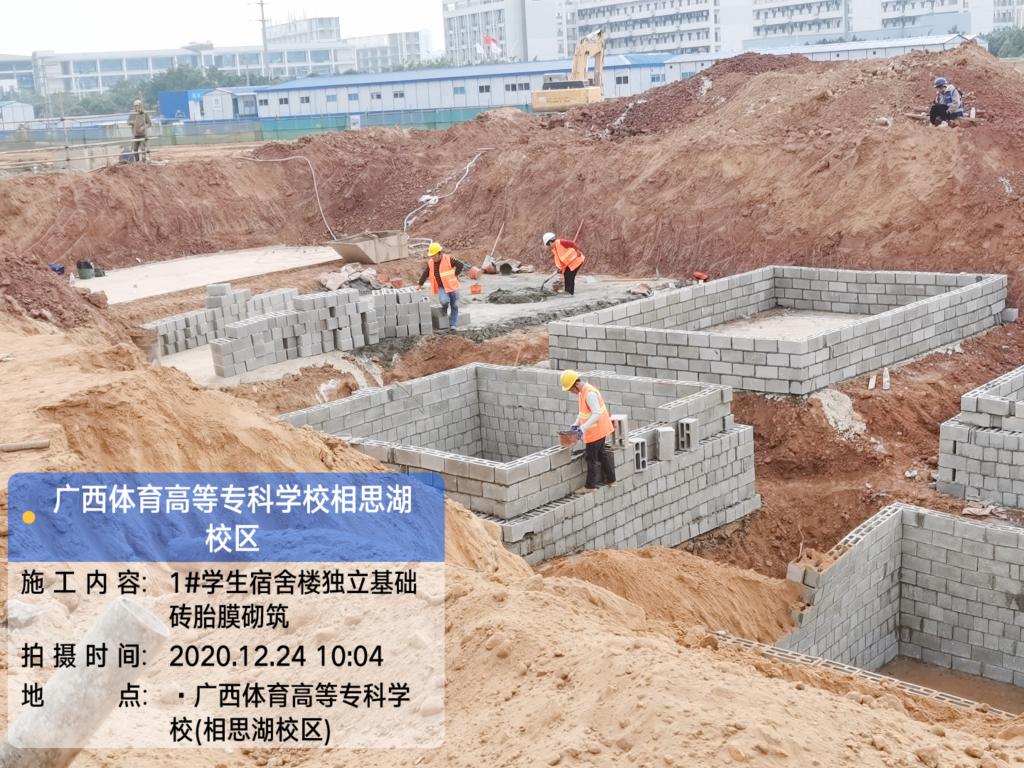 (一)完成1#学生宿舍楼天然地基砼浇筑、桩基垫层浇筑。完成2#学生宿舍楼天然地基砼浇筑,地梁模板支模、钢筋绑扎,桩基承台钢筋绑扎。完成教学、实验综合楼桩基施工。(附图1)