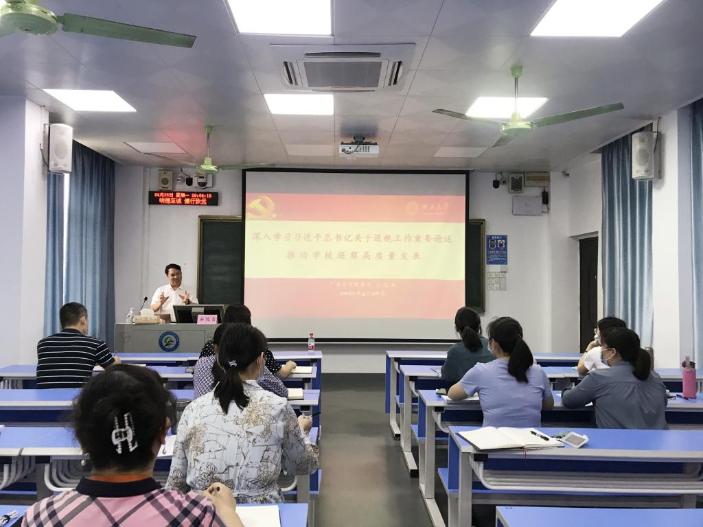 为提升学校党委巡察干部政治能力和业务素质,提高党委巡察工作规范化水平,确保学校党委巡察工作顺利开展,4月26日,学校在501教室召开党委巡察工作业务培训会。培训会特邀了广西大学纪委副书记、党委巡察工作领导小组办公室主任石远吉到校进行专题授课。会议由学校党委委员、纪委书记、党委巡察工作领导小组副组长罗黎造同志主持。学校党委巡察干部参加培训会。