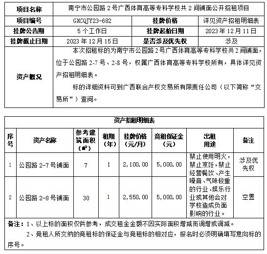 本项目我校已委托广西联合产权交易所有限责任公司进行公开招租,相关事宜请登陆此网站查看、报名http://www.gxcq.com.cn/#/projectPkg/3cc9b10ce1514de38a5165c303d9dbd6.html