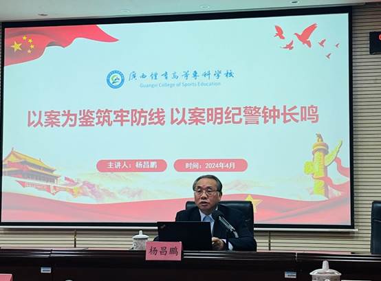 2024年4月9日,根据上级有关要求,学校在402报告厅召开“以案为鉴、以案促改、以案促治”警示教育大会,集中观看警示教育片,全体校领导、处级以上领导干部观看警示教育片。随后,学校党委书记杨昌鹏为大家上《以案为鉴筑牢防线 以案明纪警钟长鸣》廉政党课,学校领导、各学院(中心)领导班子成员、全体科级及以上干部、纪委委员参加廉政党课。会议和廉政党课由纪委书记罗黎造主持。