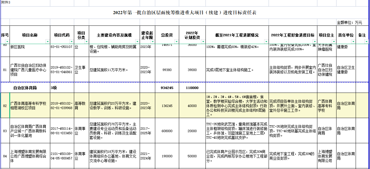 2月18日,根据《广西壮族自治区重大项目建设推进领导小组办公室关于印发2022年第一批自治区层面统筹推进重大项目方案的通知》,我校相思湖校区项目正式列入2022年第一批自治区层面统筹推进重大项目(续建)。相思湖校区项目2022年计划投入4.0亿元,主要完成项目各单体主体结构封顶,开展外立面、室内装修、室外总平施工工作。