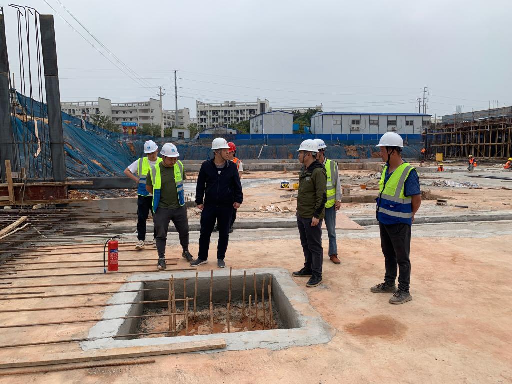 3月4日下午,南宁市高新技术产业开发区建设工程质量安全服务站(以下简称“质量安全服务站”)检查组组长闫肖峰、组员廖宇烽一行两人,到我校相思湖校区项目现场,对篮球馆的桩基、综合训练馆的基础、3#学生宿舍楼、4#学生宿舍楼、6#学生宿舍楼、食堂的主体结构进行检查指导。新校区办、全咨单位监理部和总承包单位相关人员陪同。