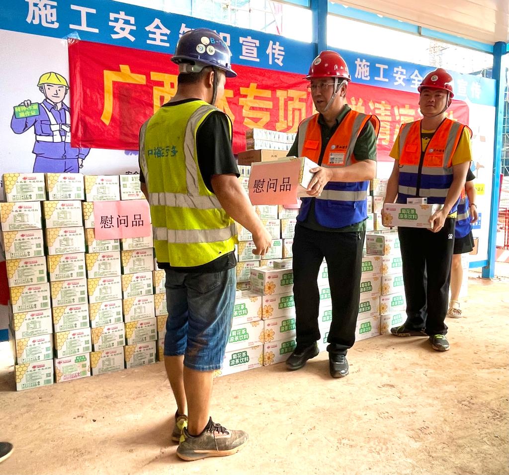 慰问组向高温下坚守岗位的一线工人发放清凉饮料和藿香正气水等降温用品,询问工友们的身体状况和工作情况,叮嘱工友们注意防暑与施工安全,要求现场负责人注意合理安排高温天气作业时间,切实做好夏季高温天气安全生产及防护措施,做好劳动保护,确保工人安全。