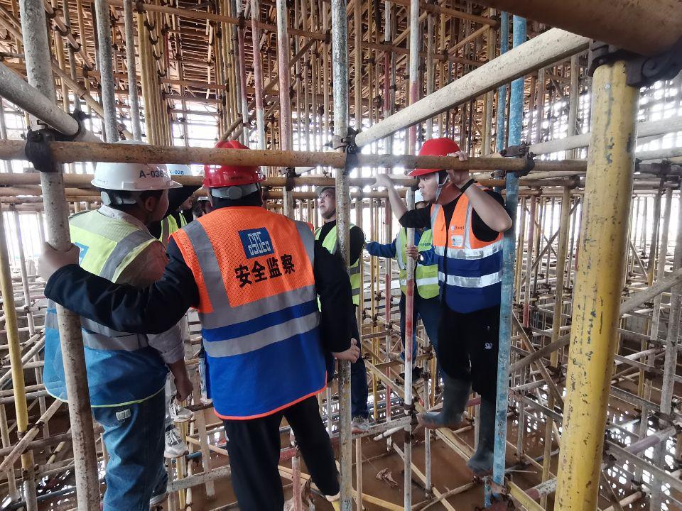 此次专项排查是根据项目游泳馆高支模论证方案,现场重点对脚手架立杆间距、纵横向水平杆搭设高度、纵横向扫地杆离地高度、纵横向扫天杆离板底高度、剪刀撑数量和距离、钢管和扣件外观质量及扣件扭力值等方面进行了全面排查,并要求总承包单位对发现问题进行限时整改和加强自检自查工作。