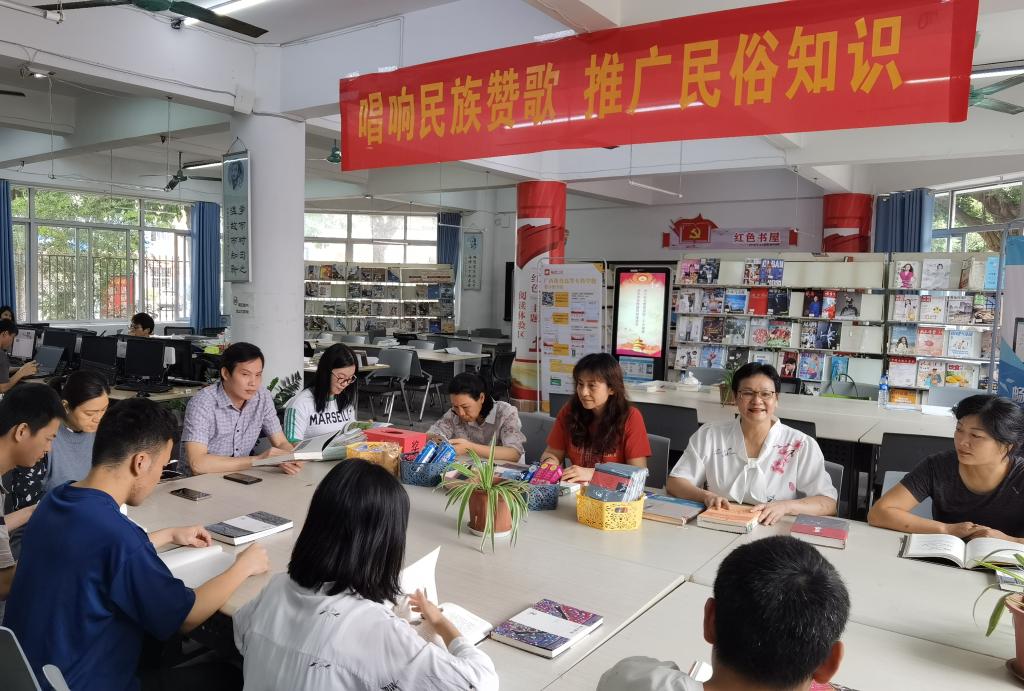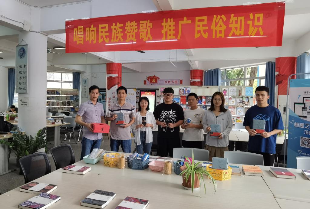 为贯彻落实党的二十大精神,深入推进学校铸牢中华民族共同体意识教育,教育引导各族师生牢固树立正确的国家观、历史观、民族观、文化观、宗教观,增进各族师生对伟大祖国、中华民族、中华文化、中国共产党、中国特色社会主义的认同,结合学校图书馆读书月活动安排,于4月24日上午,在北京人天书店集团畅想之星信息技术有限公司协助下,图书馆开展了“唱响民族赞歌,推广民俗知识”活动,活动由图书馆馆长曾玮主持。学习了《我们的广西》丛书,《三月三探索广西》专题书籍,让师生们了解广西,了解广西民俗知识,促进民族进步感党恩。