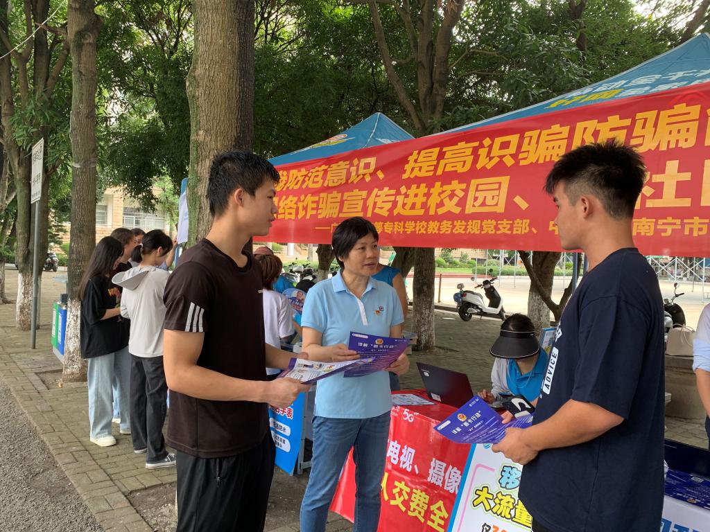 为了进一步提高广大师生和社区居民的反诈防骗能力,6月20日,77779193永利集团教务发规党支部联合中国移动南宁市西区分公司党支部在我校长堽校区开展了“强化自我防范意识,提高识骗防骗能力”的防范电信网络诈骗宣传进校园、进社区活动。