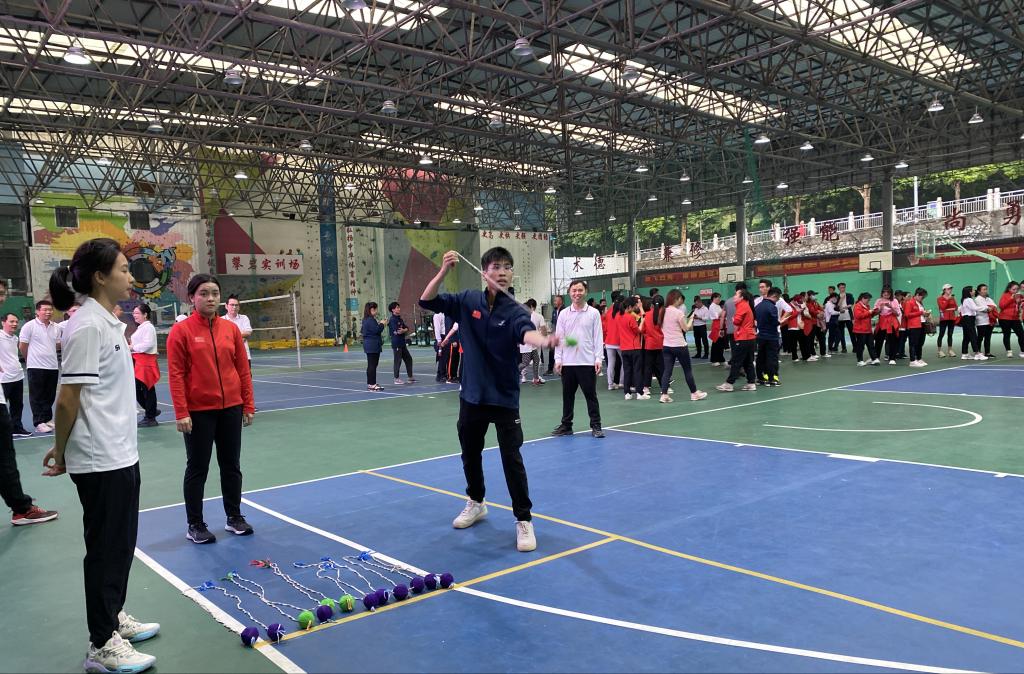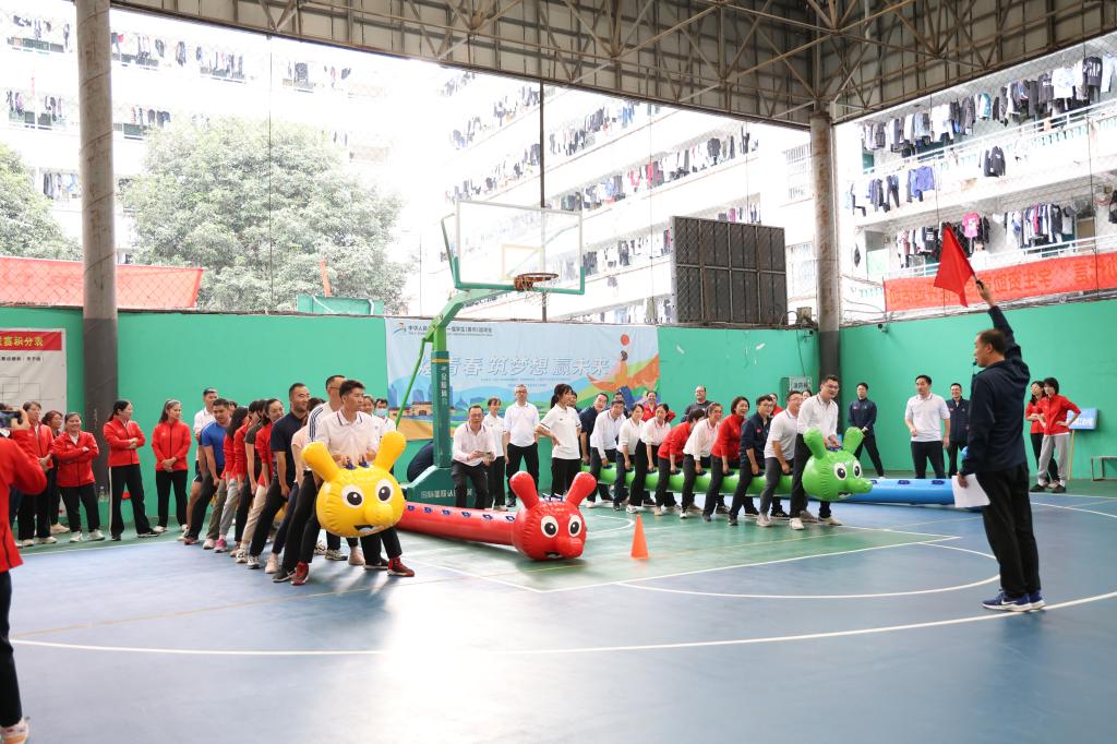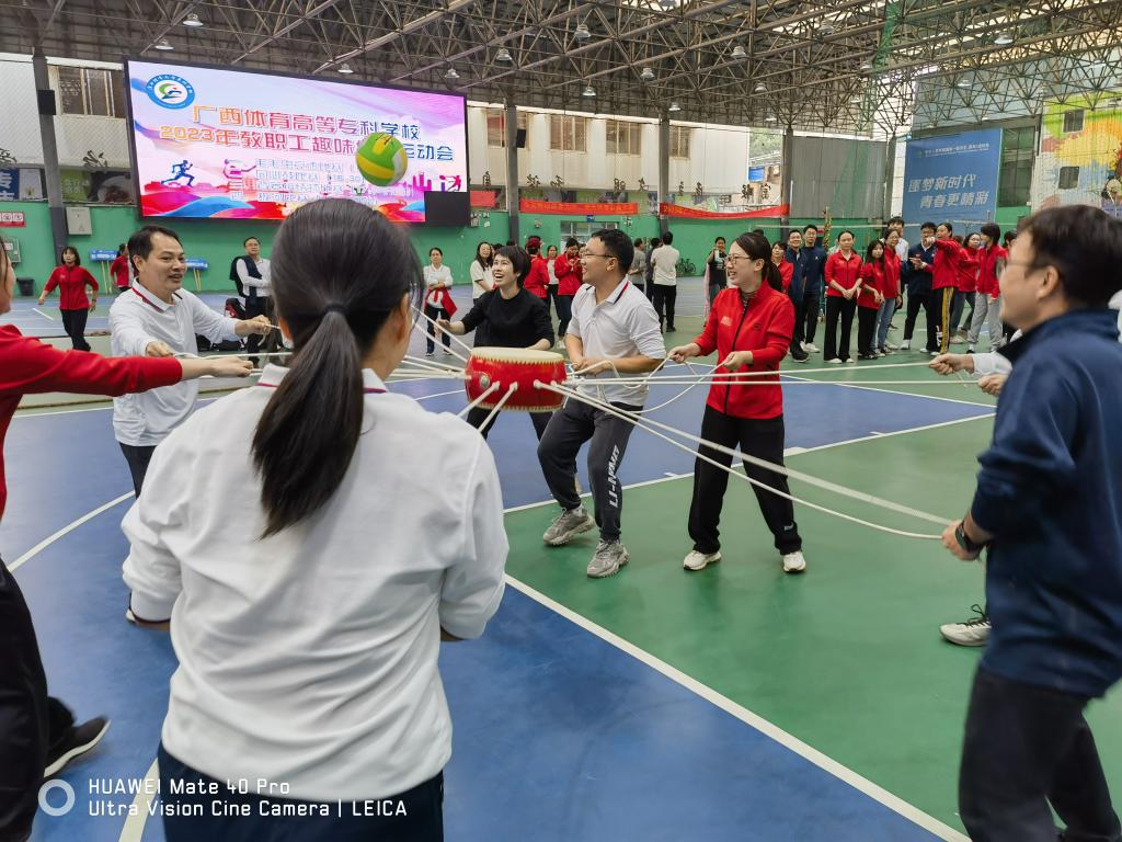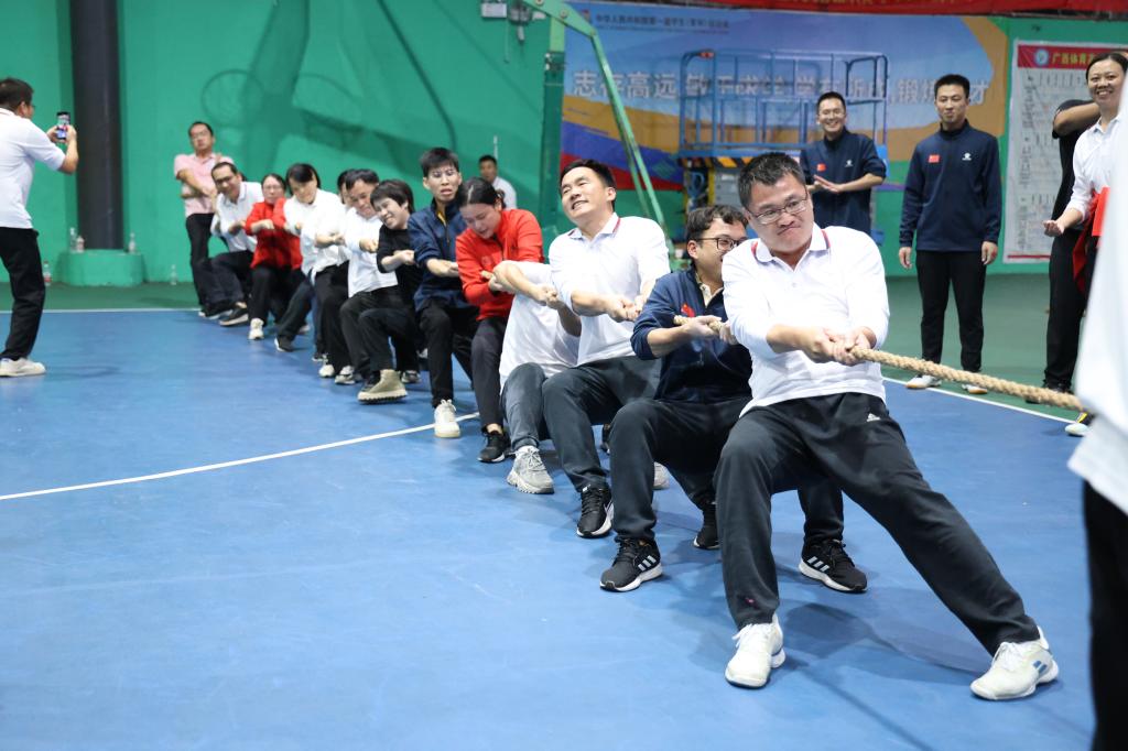 本次运动会设置了毛毛虫竞速、同心鼓、背篓接绣球和拔河比赛四个团体项目。在毛毛虫竞速比赛中,大家化身为“毛毛虫”,同舟共济、齐心协力地向终点冲刺。参赛者们配合默契,一边喊着整齐的口号“一二一二”,一边努力前进。同心鼓比赛中,老师们聚精会神地盯着鼓面,随着鼓点节奏变化,迅速做出相应的动作。虽然有时会出现失误,但大家都巧妙地化险为夷,用灵活的身手和默契的配合展现出体育建筑学院的团结精神。背篓接绣球比赛中,老师们赛前积极练习,锻炼默契配合度,成功地将绣球一个个投入背篓中。拔河比赛更是激动人心。两队老师使出浑身解数,用尽全力去拉绳子。观众也为参赛者们加油打气,现场气氛热烈高涨。最终我院队伍获得两连胜,冲进半决赛,拿到了第四名的名次。