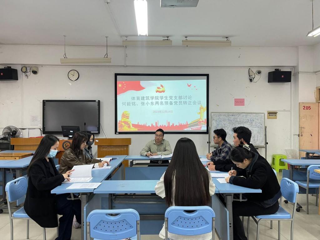 体育建筑学院学生党支部于12月14日下午在长岗校区瑞兴楼205室召开预备党员转正会议。会议主要讨论关于何毅铭、张小东两名同志申请转为正式党员的问题。学院专职辅导员惠楚云、梁甜甜参加本次会议,本次会议由体育建筑学院学生党支部书记尹晶章主持。