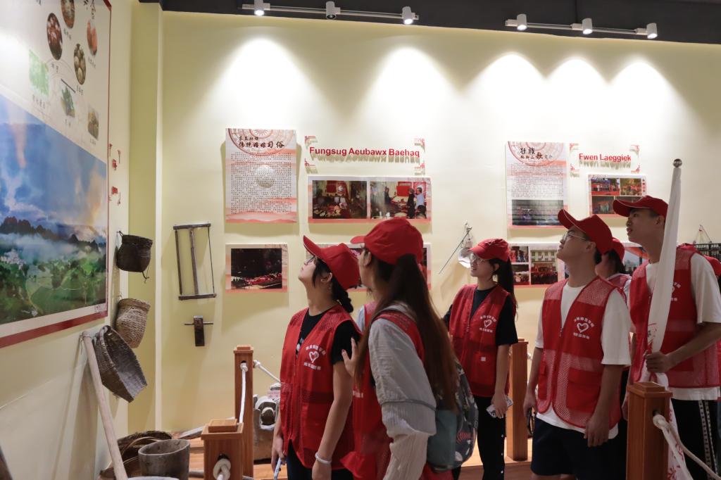 志愿者在“壮族勒脚山歌”传承基地参观壮族文化展