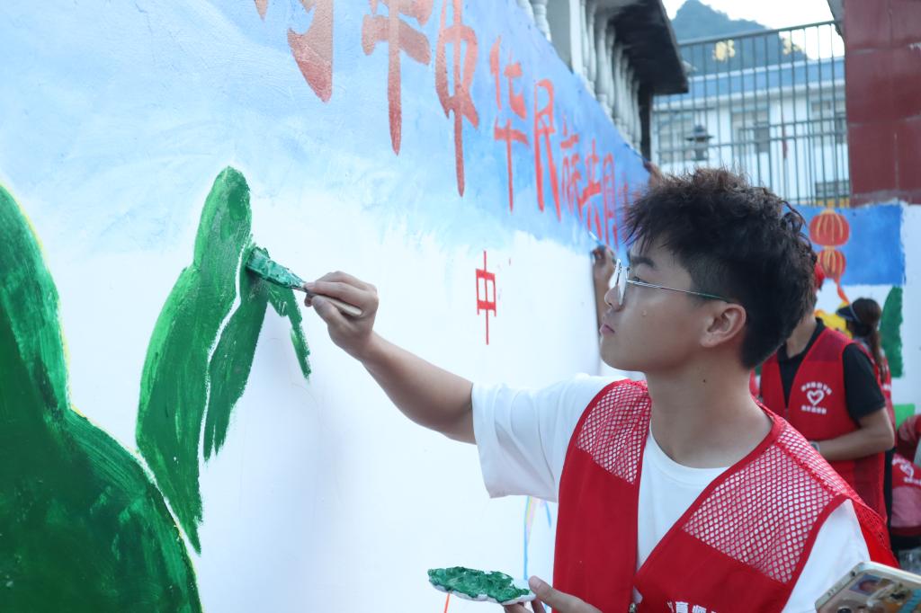8月6日至7日,“同心筑梦”民族团结实践团首先赴武篆镇那烈村,与那烈村村委干部、群众代表进行交流座谈。在那烈村党总支部书记的详细介绍下,师生们对那烈村的历史和乡村振兴的发展有了更深入的了解。随后,师生们拿起铲子、手套等工具前往那列村民族团结进步文化长廊区域开展清洁乡村行动。最后实践团结合那烈村的民族特色和村域发展,充分发挥体育教育专业和小学教育专业的优势,以墙为布,以笔为媒,用绚丽的色彩和生动的图案,为那烈村绘制了一幅富有民族团结和地方特色的手绘墙画。在绘画过程中,同学们顶着炎炎烈日,怀着满腔热情,用心用情勾画着每一笔,经过大家共同努力,普通单调的白墙摇身变成了美化村庄靓丽名片,成为那烈村“民族团结一家亲”鲜明生动的宣传新阵地。