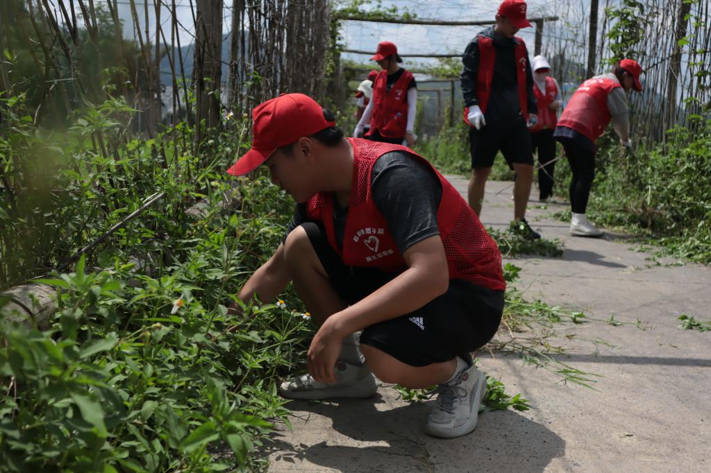 志愿者们在那烈村民族团结进步文化长廊下除草