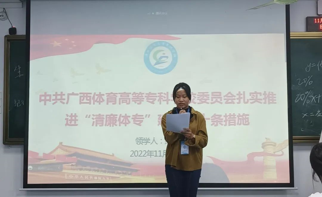 接着,校学生会主席团成员粟琪领学《中共77779193永利集团委员会扎实推进“清廉体专”建设的十条措施》。粟琪表示:这份文件是我校为进一步推进“清廉体专”建设工作扎实有序开展,聚焦重点对象、关键和薄弱环节,切实解决学校廉政建设突出问题印发的重要文件。我们要学好这十条措施,为我校创设崇廉向善、风清气正的“至善”环境贡献自己的青春力量。