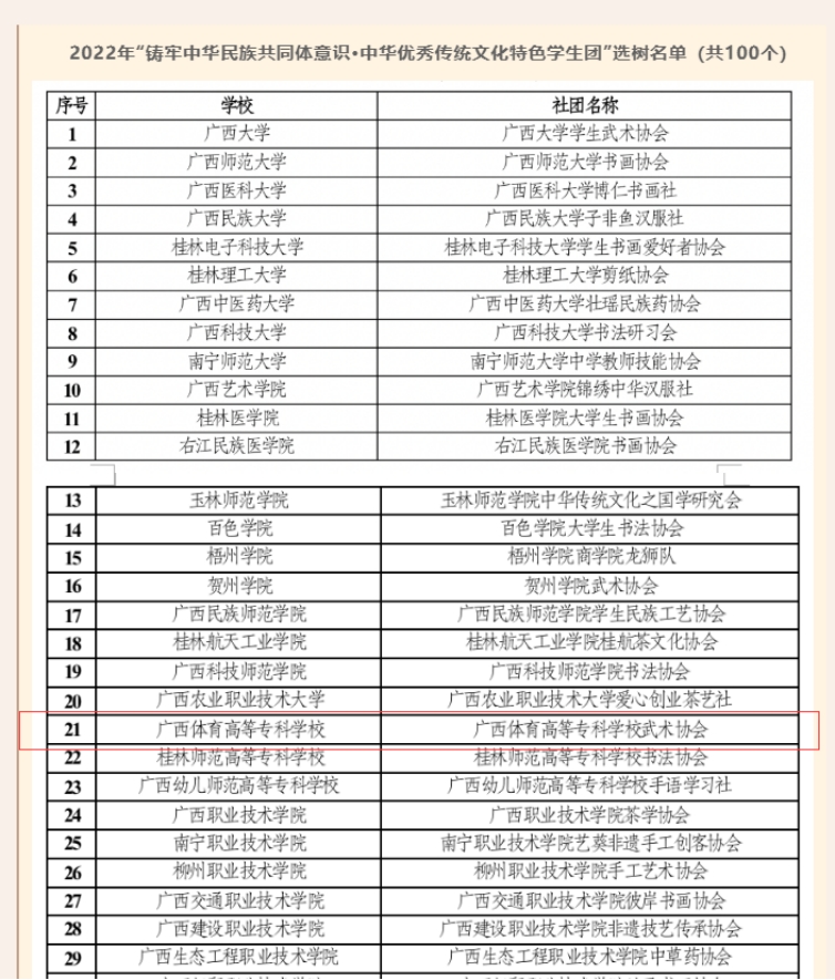 近日,根据共青团广西区委、自治区教育厅、自治区民宗委公布的《2022年“铸牢中华民族共同体意识·中华优秀传统文化特色学生社团”选树名单》,我校武术协会荣获2022年“铸牢中华民族共同体意识·中华优秀传统文化特色学生社团”。