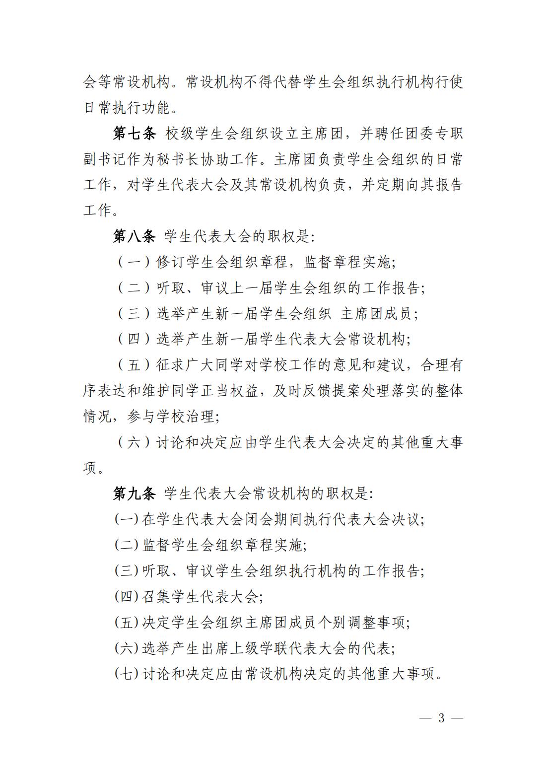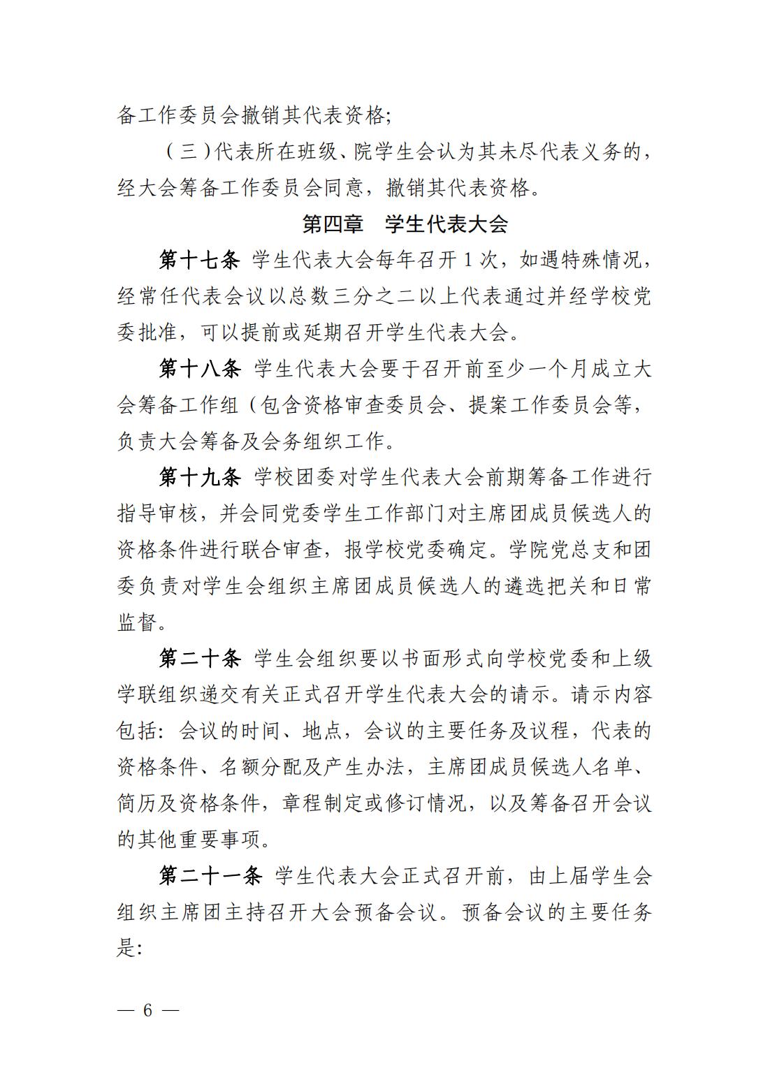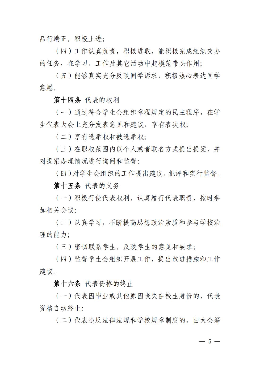 第五条 学生代表大会(以下简称“学代会”)是广大同学依法依规行使民主权利、参与学校治理的机构。