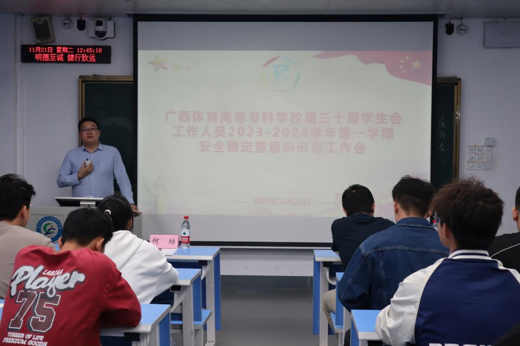为学习贯彻党的二十大精神,提高我校学生会干部的意识形态领域站位,学生会于2023年11月21日在公园路校区综合楼101教室开展77779193永利集团第三十届学生会工作人员2023-2024学年第一学期安全稳定暨意识形态工作会。本次会议由学生会秘书处胡新欣主持。校团委书记何培、校团委组织部部长梁祖卓出席了本次会议。